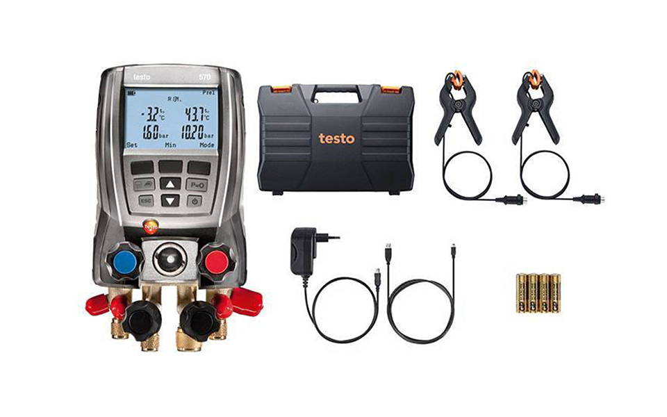 testo 570 專業(yè)級電子冷媒表組套裝、包括主機(jī),4通閥組,內(nèi)部數(shù)據(jù)存儲器、集成真空測量探頭,3個溫度探頭連接,2個鉗形探頭、testo EasyKool 專業(yè)電腦操作軟件(用戶可下載)、USB數(shù)據(jù)線,儀器箱、電源適配器,電池以及出廠報告。